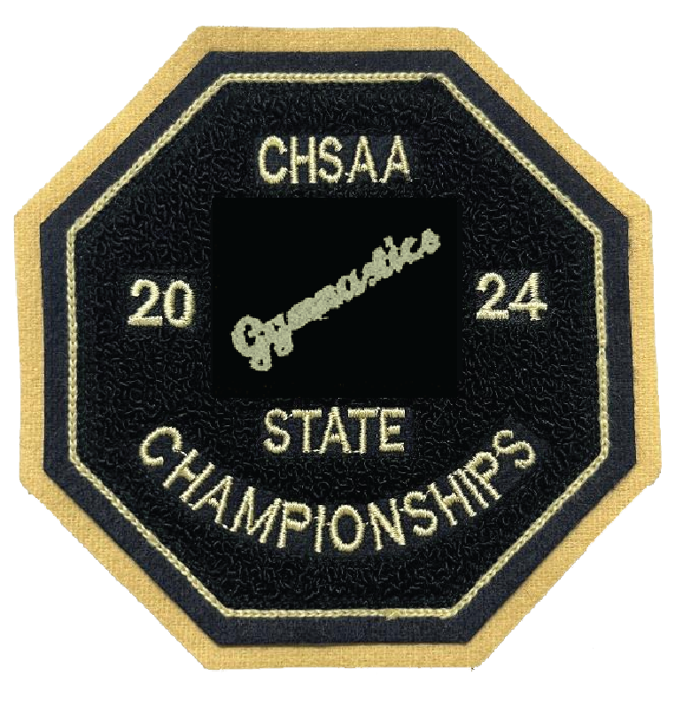This is the souvenir letterman patch available for the 2024 CHSAA State Gymnastics Championships.
