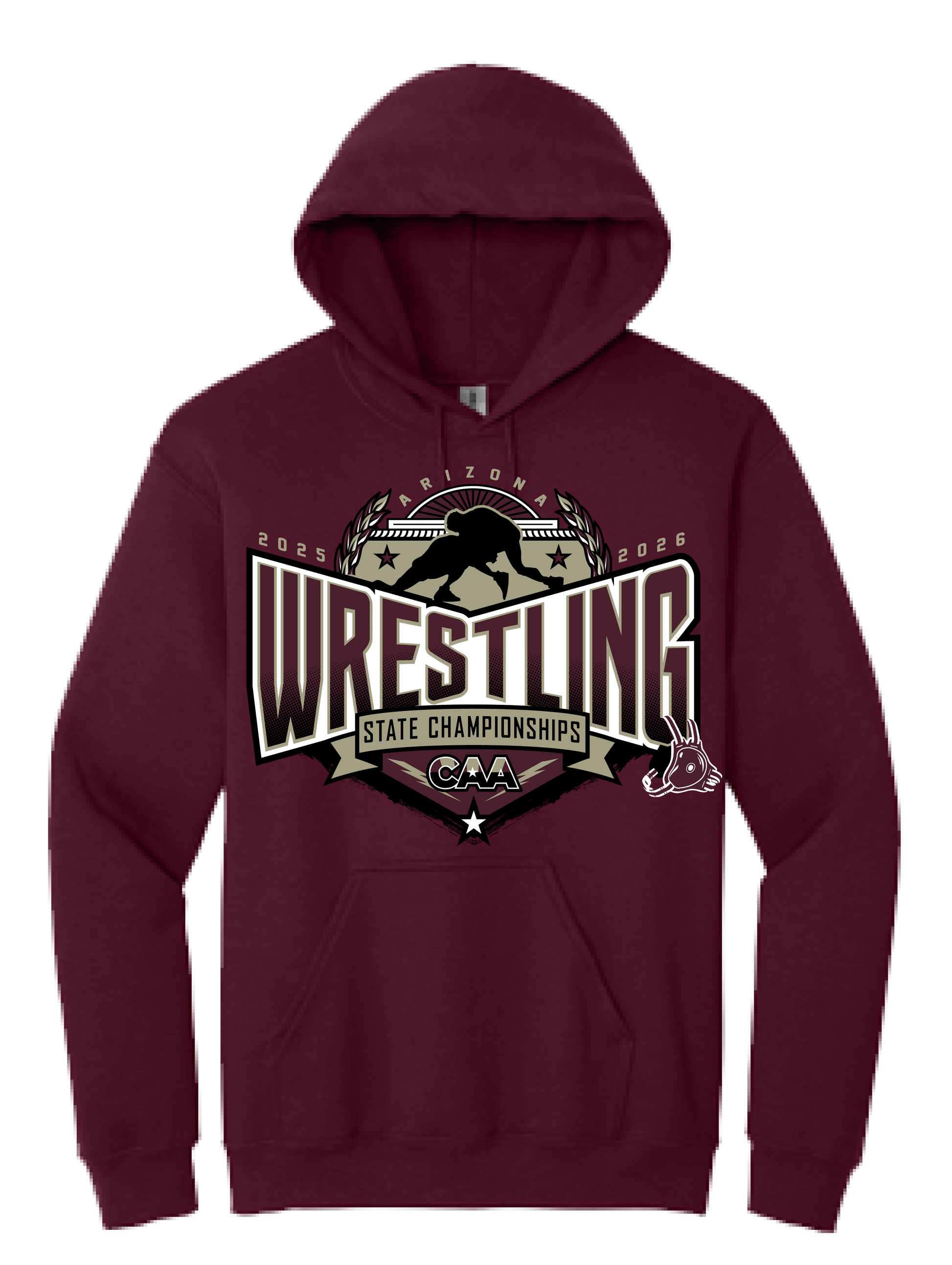 This is the souvenir hooded sweatshirt (Maroon) available for the 2025-26 CAA State Wrestling Championships. To order a customized version of this shirt, please call in your order to us at 602-386-3460.